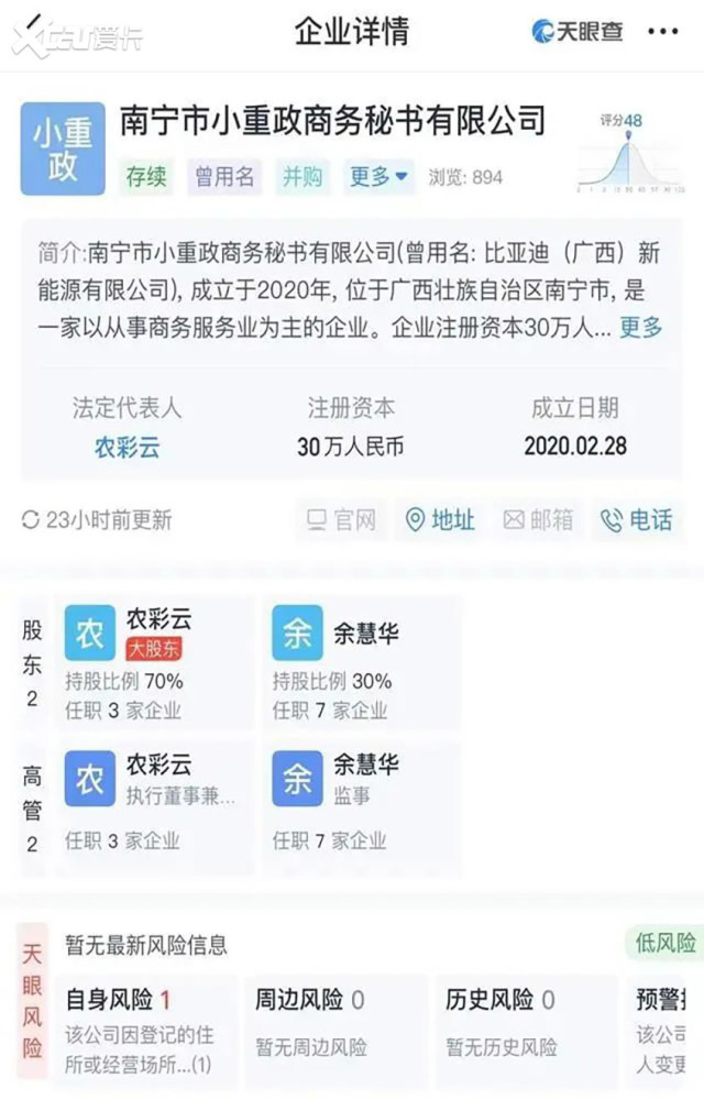 事件的起因是有市場消息稱,比亞迪旗下子公司全資收購了南寧市小重政商務(wù)秘書有限船山區(qū)代辦公司注冊公司(以下簡稱“小重政商務(wù)”),公司更名為比亞迪(廣西)新能源有限公司,且注冊資本由30萬元增加至1億元。